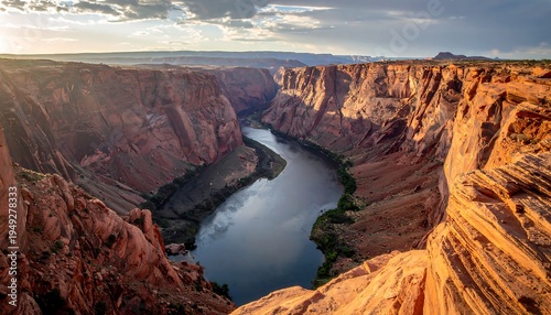 River carves through a deep canyon; sunlight reflects on water, highlighting rock layers