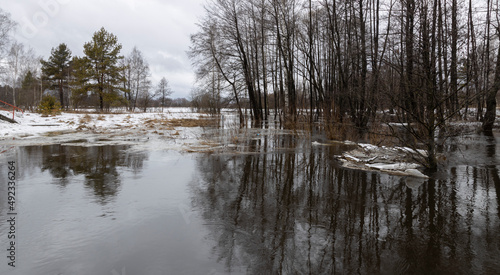River in flood. Landscape with a river. Trees in the water. Last year's grass on thawed patches. Thaw, melting snow.