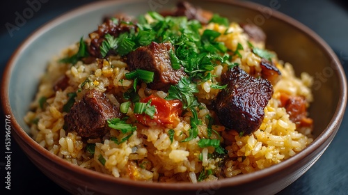 Riz gras with savory meat, garnished with parsley