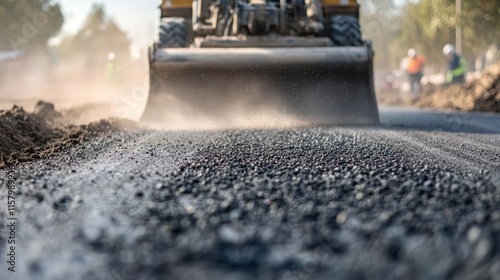 Road construction, asphalt paving machine leveling fresh asphalt.