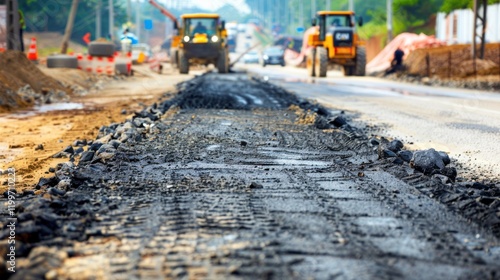 Road repair, asphalt paving, construction, city street, machinery, background traffic, daytime, progress