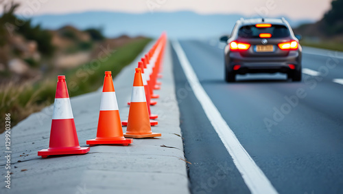 Road safety cones placed along highway during construction, symbolizing traffic control and transportation safety measures