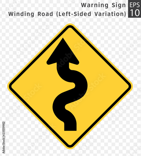 Road Sign. Warning. Winding Road (Left-Sided Variation). Vector Illustration on Transparent Background