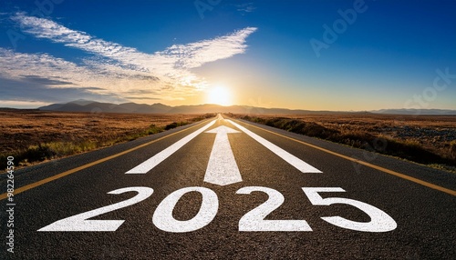 Road to 2025 with an empty road with written 2025 and arrow pointing towards the horizon to represent the future and positivity and success of the new