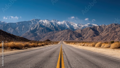 Road to mountains with snow under clear sky