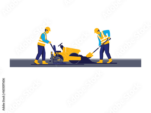 Road Workers on Asphalt: Two road workers, dressed in protective gear, meticulously operate a roller and shovel on a fresh asphalt surface. Capturing the precision, skill.