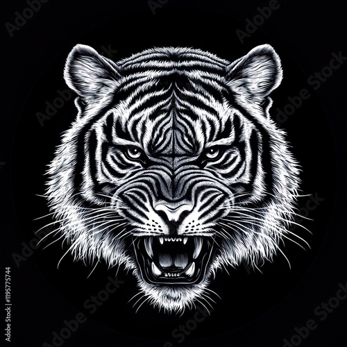 Roaring tiger head, monochrome art, dark background, apparel design