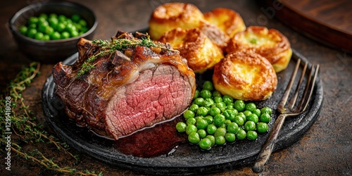 Roast Beef with Yorkshire Pudding and Peas on a rustic stone background