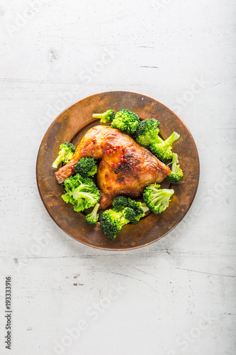 Roast chicken Leg. Chicken roasted leg with broccoli on table