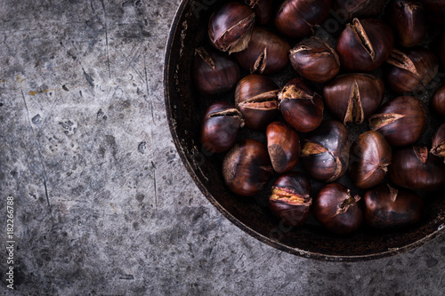 Roasted chestnuts on an old board. healthy food concept