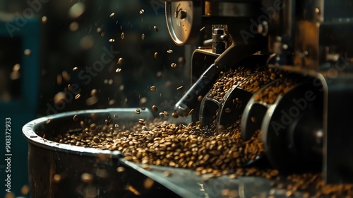 Roasted coffee beans are being poured into a cooling tray.