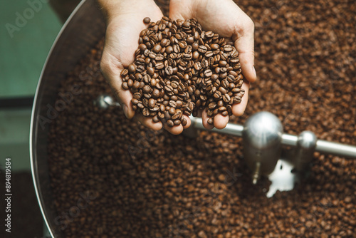 Roasted Coffee Beans Held Above Roasting Machine, Top View