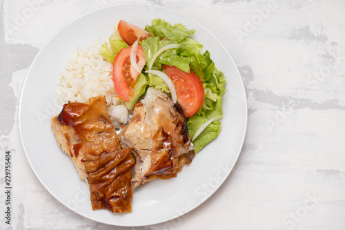roasted pork with boiled rice and salad on white plate