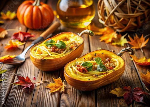 Roasted Spaghetti Squash Halves, Autumn Harvest, Rustic Kitchen Still Life