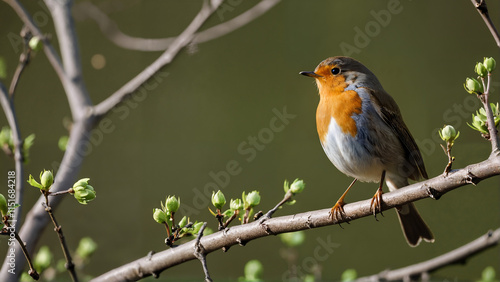 Robin perched on a bare branch, singing brightly amidst the first green buds of spring
