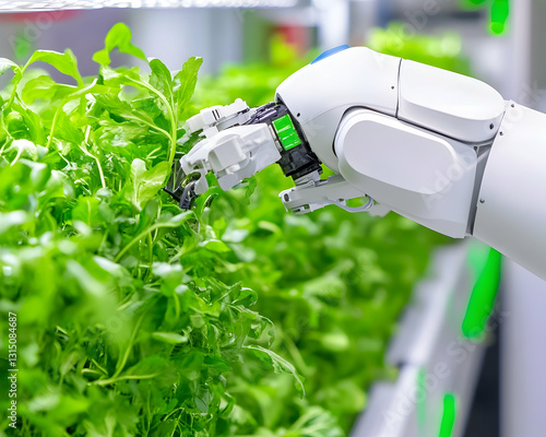 Robot hand harvesting lettuce in a vertical farm, showcasing automation & agriculture