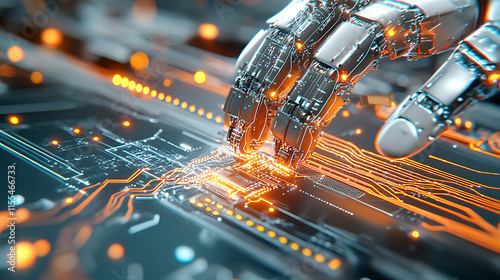 Robot hand manipulating circuit board high-tech lab digital art futuristic environment close-up view innovation concept