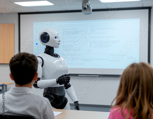 Robot teaching children in futuristic classroom, friendly atmosphere