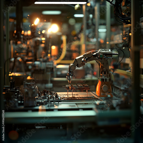 Robotic arm assembling components high-tech factory industrial action automation environment close-up view advanced technology