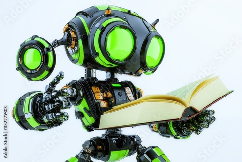 Robotic Figure Holding an Open Book with Both Hands in a Studio Setup with Plain White Background