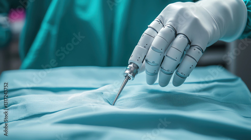robotic hand performing surgery on blue surgical drape, showcasing precision and technology