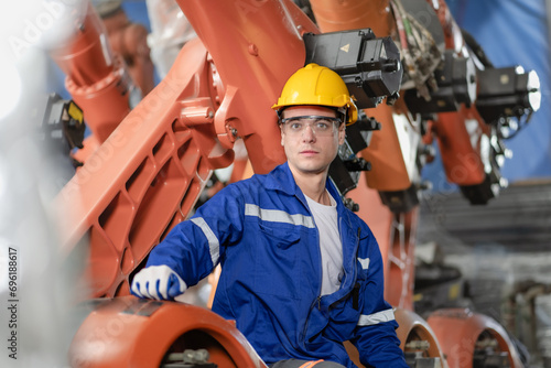 Robotic maintenance engineer working on robot arm connection and monitoring control. Professional technician industry 4.0 robotic engineering workshop in electronic futuristic manufacturing research.