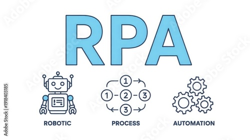 Robotic process automation concept illustrated with clear icons depicting a robot workflow steps and operational gears for business efficiency