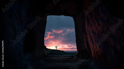 Rock-Cut Tomb Entrance at Dawn with a Single Cross Silhouette