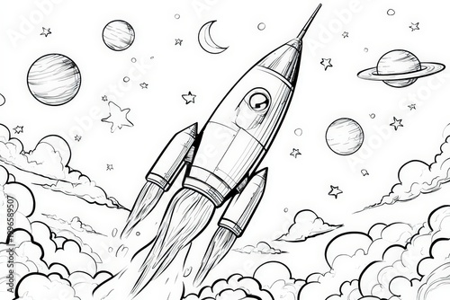 Rocket Launch Coloring Page with Planets, Stars, and Moon for Kids