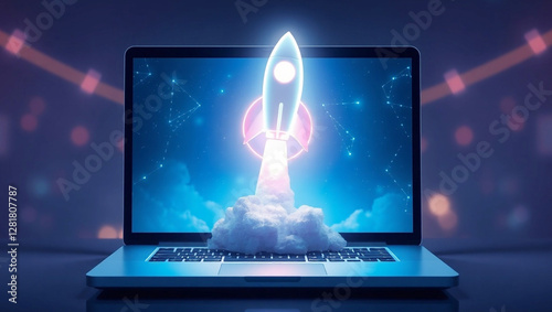 Rocket Launch from Laptop. Innovation, Technology, and Startup Growth.