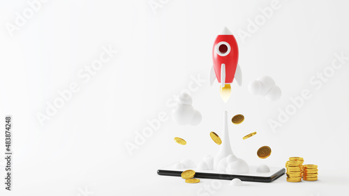 Rocket launch from smartphone. The concept of launching a business product to the market. 3D rendering.