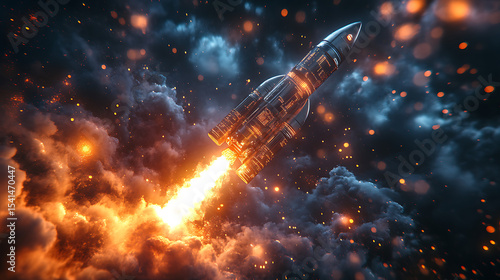 Rocket launching into a dramatic sky filled with clouds and glowing embers, symbolizing exploration