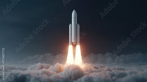 Rocket Launching into Dark Skies with Bright Flames and Smoke, Technology, Space Exploration, Adventure, and Innovation Concept
