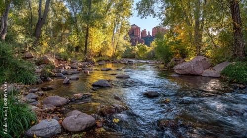Rocky stream flows through a vibrant forest with distant towering formations under a clear sky