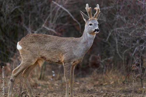 Roe buck at the feeding spot in the forest