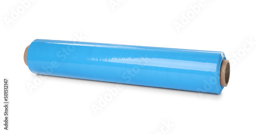Roll of light blue stretch wrap isolated on white