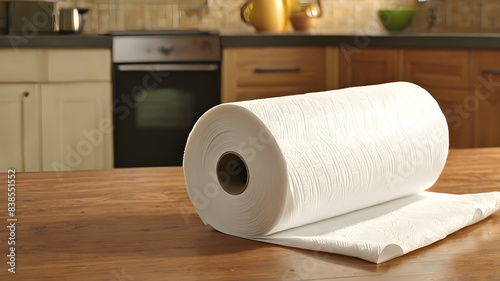 Roll of paper towels on table in kitchen, closeup Generative AI