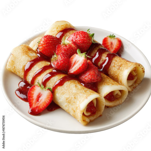 Rolled crepes topped with strawberries and sauce