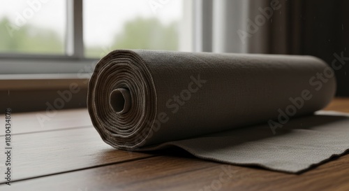 Rolled textile material rests on a wooden surface near a window with an outdoor view