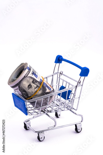 Rolled up 100 american dollar bills lie in a miniature supermarket shopping trolley on a white background