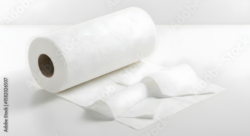 Rolled white paper towels, unwound and spread out on a white surface