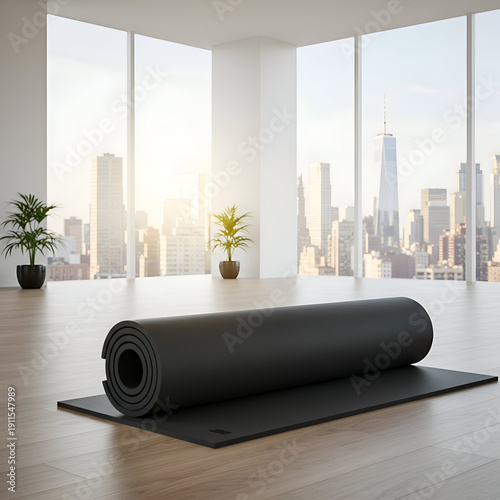 Rolled yoga mat in a modern city studio with panoramic windows. Urban setting for a yoga instructor. Wellness professional's urban studio. New York City.