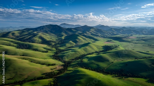 Rolling green hills covered soft grass under a clear sky with midday sunlight birds eye view capturing expansive open fields and farmlands pure natural lighting no artificial effects