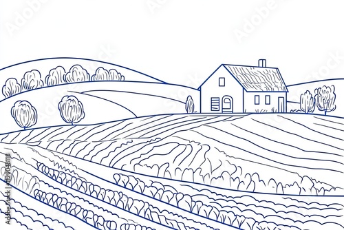 Rolling Hills Farmhouse Rural Landscape Drawing