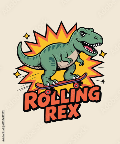 Rolling Rex Funny Dinosaur Cartoon Typography T Shirt Design