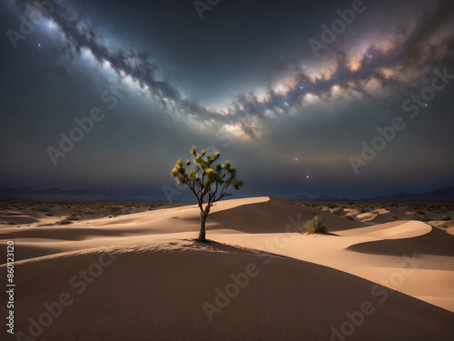 Rolling sand dunes under a sky bursting with stars, perhaps with a single, lonely tree or a cactus in the foreground.