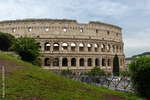 Roman Colosseum, the largest ancient amphitheatre ever built, Italy. Arches, exterior facade. Giardinetto del Monte Oppio. Rome, Italy