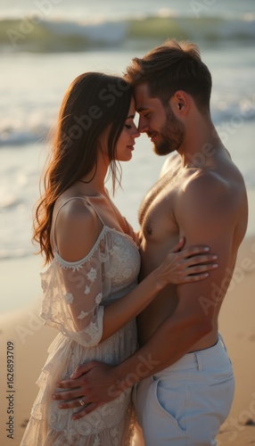Romantic couple embracing on a sunlit beach