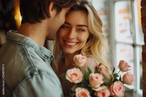 Romantic Couple Embracing with Roses in Cozy Indoor Setting