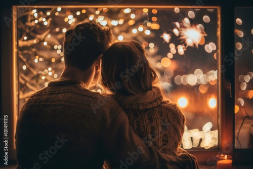 Romantic couple enjoying winter christmas evening lights from home window